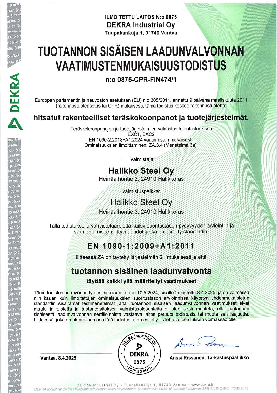 Tarjoamme asiakkaillemme laadukkaat lopputuotteet ja palvelut. Todistuksena korkealaatuisista tuotantoprosesseistamme ja prosessinhallinnasta meillä on tarkastuslaitoksen myöntämät sertifikaatit. Laatujärjestelmämme ISO 9001 on DEKRA Industrial Oy:n sertifioima.